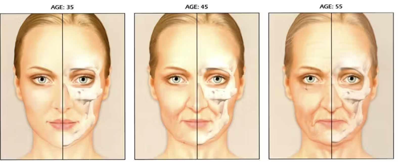 Bone, fat, and collagen form a three-layer scaffold that shapes the cheeks. With each passing decade: