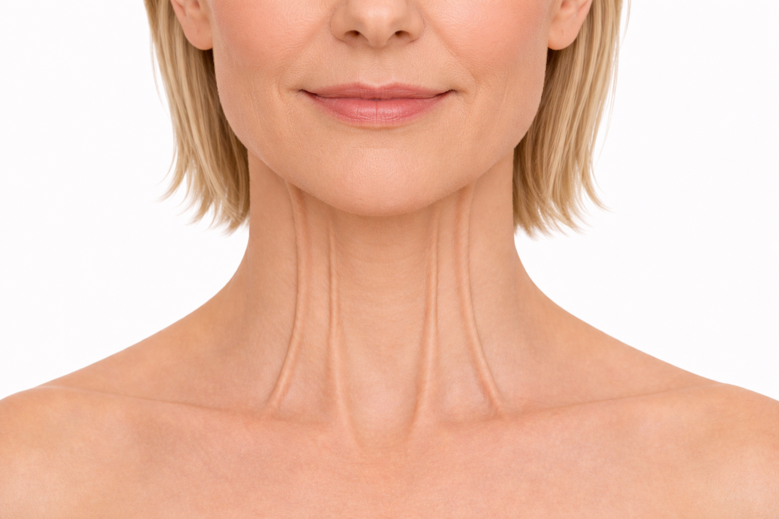 crepey texture • horizontal neck lines • thinning skin • early jawline laxity • loss of firmness • early banding